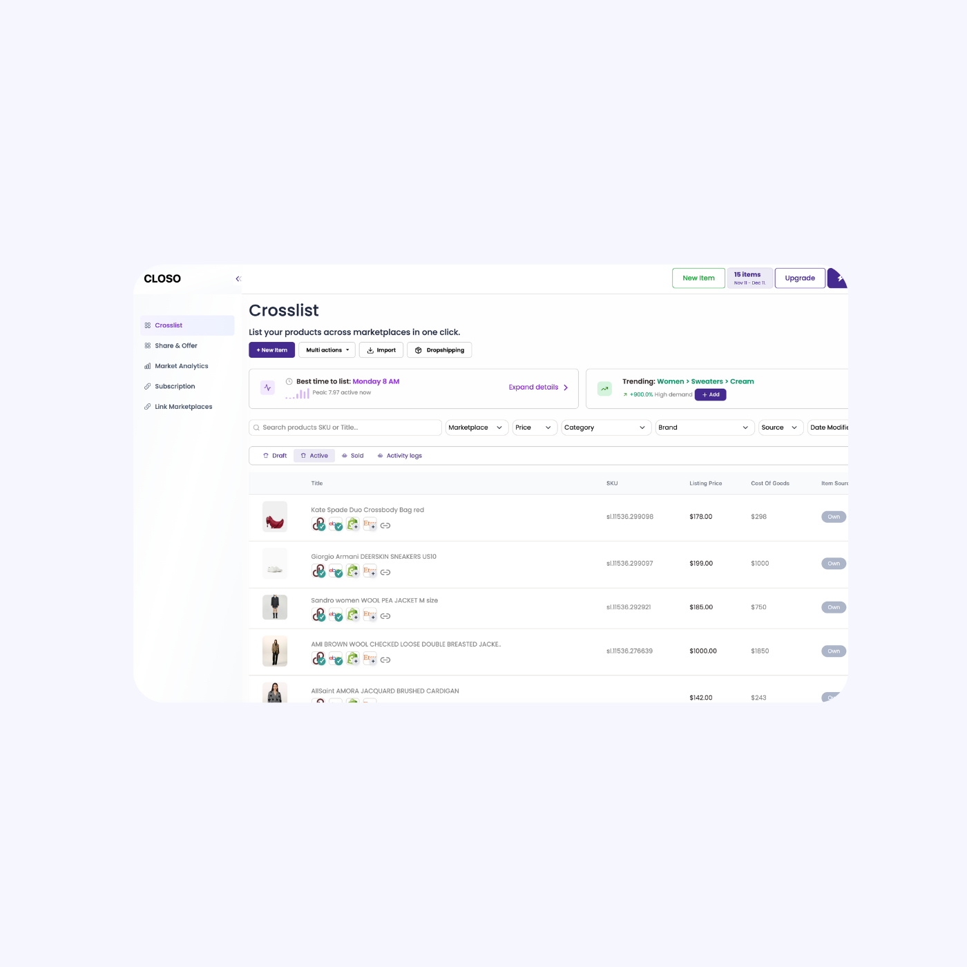 Closo uses real-time sales data to identify peak buyer activity, sharing your listings when shoppers are most likely to purchase.